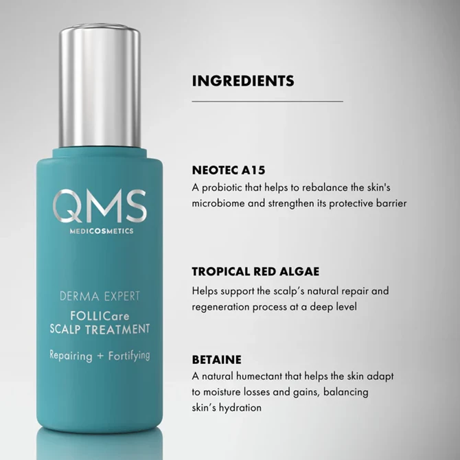 Iskusite snagu našeg naprednog tretmana za vlasište, formuliranog s QMS NEOTEC A15™ kompleksom - snažnom mješavinom atelokolagena i višedimenzionalne hijaluronske kiseline. Ova inovativna, nemasna formula djeluje na popravak i obnovu vlasišta, jačanje zaštitne barijere kože i poticanje rasta kose za vidljivo jaču i gušću kosu.