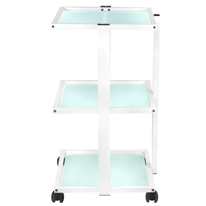 Estetski stol za kozmetičke aparate, od metala i stakla, sa gumiranim kotačima.