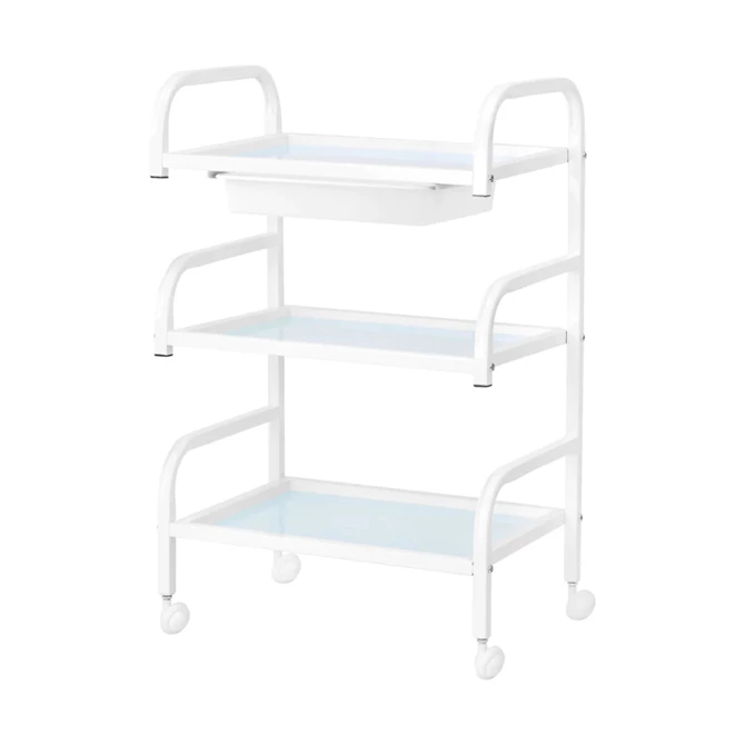 Okvir izrađen od izdržljivog aluminija u bijelim nijansama i staklene police stvaraju modernu i estetsku cjelinu koju je lako održavati čistom. Četiri kotača osiguravaju mobilnost za jednostavnu organizaciju radnog prostora, dok čvrsti materijali jamče stabilnost i trajnost korištenja.